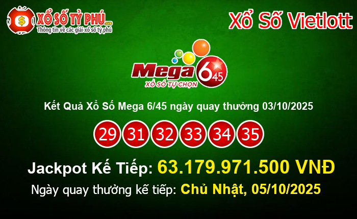 Kết Quả Xổ Số Mega 6/45 Ngày 03/10/2025: Jackpot Tiếp Tục Tăng Lên Mốc 63.179.971.500 VNĐ