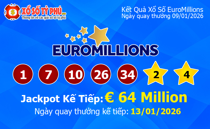 - Kết Quả Xổ Số Tự Chọn EuroMillions Ngày Quay Thưởng 09/01/2026: Jackpot Tăng Tiếp Lên Mốc €64 Triệu EURO 9 Tháng Một, 2026