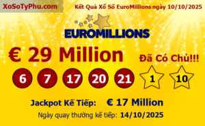 Kết quả xổ số EuroMillions ngày quay thưởng 17/10/2025 (Tính theo giờ Việt Nam) vẫn chưa tìm ra chủ nhân may mắn nhất trúng giải Jackpot. Giá trị Jackpot của xổ số EuroMillions tiếp tục tăng lên mốc €39 Triệu EURO tương đương hơn 1136.89 Tỷ VNĐ.