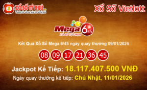 Kết quả xổ số Mega 6/45 của Vietlott ngày 04/01/2026 (Kỳ quay thưởng #01454) vẫn chưa tìm ra chủ nhân may mắn nhất trúng giải Jackpot. Giá trị Jackpot của xổ số Mega 6/45 tiếp tục tăng lên mốc 14.884.127.500 VNĐ tương đương hơn 633.37 Ngàn Đô-la Mỹ.