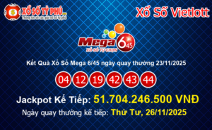 Kết quả xổ số Mega 6/45 của Vietlott ngày 30/11/2025 (Kỳ quay thưởng #01439) vẫn chưa tìm ra chủ nhân may mắn nhất trúng giải Jackpot. Giá trị Jackpot của xổ số Mega 6/45 tiếp tục tăng lên mốc 13.413.193.000 VNĐ tương đương hơn 570.77 Ngàn Đô-la Mỹ.