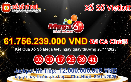 Giải thưởng xổ số Mega 6/45 của Vietlott với giá trị Jackpot trị giá 61.756.239.000 VNĐ tương đương hơn 2.63...