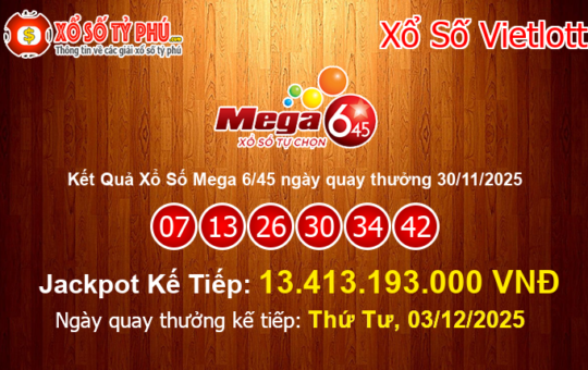 Kết quả xổ số Mega 6/45 của Vietlott ngày 30/11/2025 (Kỳ quay thưởng #01439) vẫn chưa tìm ra chủ nhân...