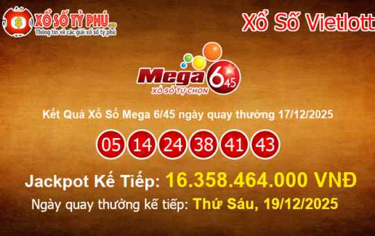 Kết quả xổ số Mega 6/45 của Vietlott ngày 17/12/2025 (Kỳ quay thưởng #01446) vẫn chưa tìm ra chủ nhân...