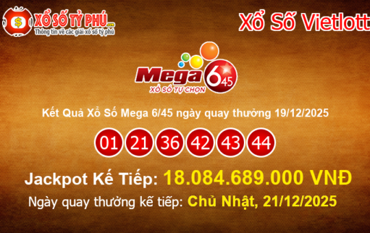 Kết quả xổ số Mega 6/45 của Vietlott ngày 19/12/2025 (Kỳ quay thưởng #01447) vẫn chưa tìm ra chủ nhân...