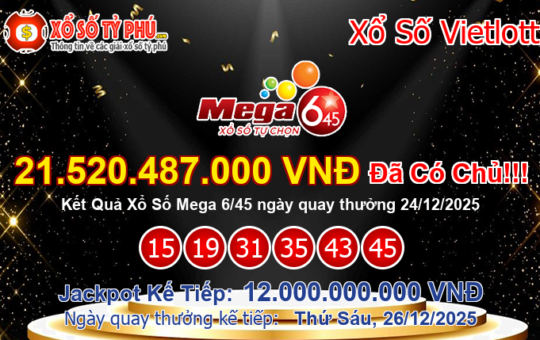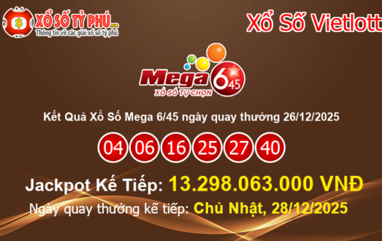 Kết quả xổ số Mega 6/45 của Vietlott ngày 26/12/2025 (Kỳ quay thưởng #01450) vẫn chưa tìm ra chủ nhân...