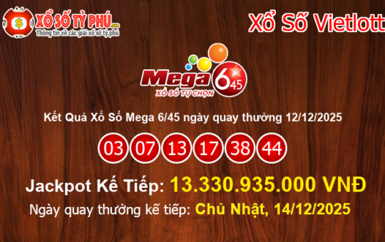 Kết quả xổ số Mega 6/45 của Vietlott ngày 12/12/2025 (Kỳ quay thưởng #01444) vẫn chưa tìm ra chủ nhân...