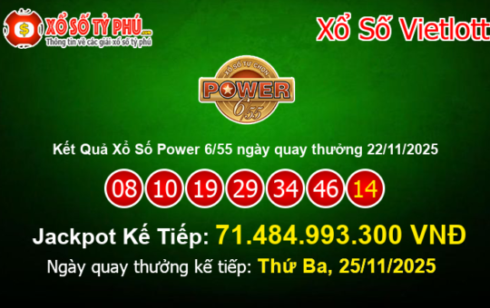 Kết quả xổ số Power 6/55 của Vietlott ngày 22/11/2025 (Kỳ quay thưởng #01272) vẫn chưa tìm ra chủ nhân...