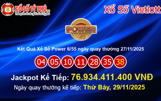 Kết quả xổ số Power 6/55 của Vietlott ngày 27/11/2025 (Kỳ quay thưởng #01274) vẫn chưa tìm ra chủ nhân...