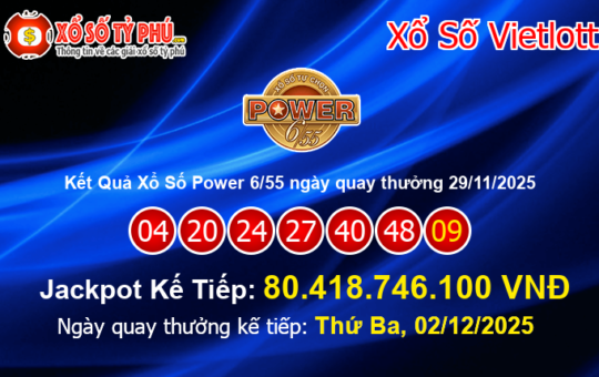 Kết quả xổ số Power 6/55 của Vietlott ngày 29/11/2025 (Kỳ quay thưởng #01275) vẫn chưa tìm ra chủ nhân...