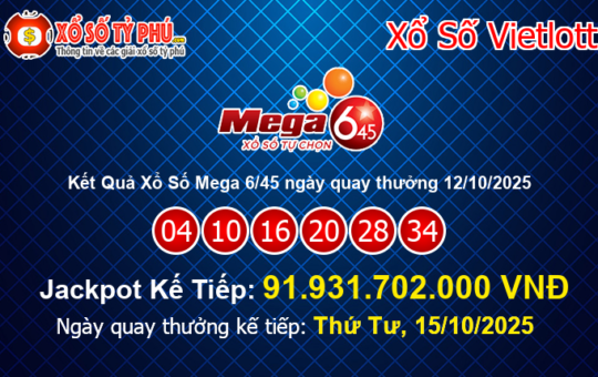 Kết quả xổ số Mega 6/45 của Vietlott ngày 12/10/2025 (Kỳ quay thưởng #01418) vẫn chưa tìm ra chủ nhân...