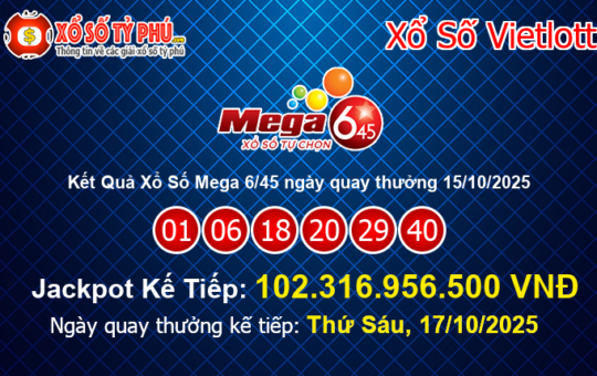 Kết quả xổ số Mega 6/45 của Vietlott ngày 15/10/2025 (Kỳ quay thưởng #01419) vẫn chưa tìm ra chủ nhân...